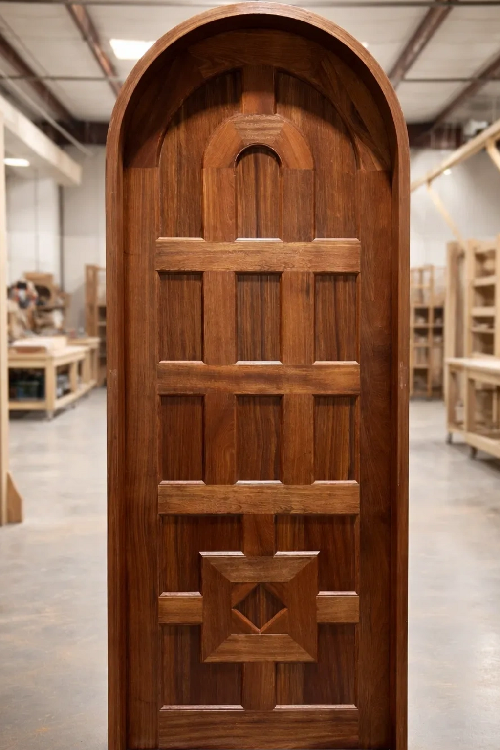 Designed for a Spanish Colonial residence, this arched entry system integrates traditional panel geometry with precision-milled hardwood construction. Custom radius frame and raised panel detailing engineered for structural longevity and architectural authenticity.