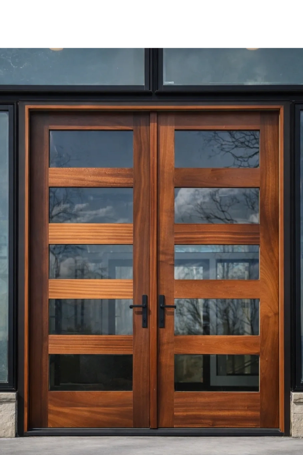 Designed for a contemporary residence, this double entry system pairs horizontal glass integration with precision-milled solid hardwood construction. Engineered for structural stability while maintaining clean architectural lines and material warmth.